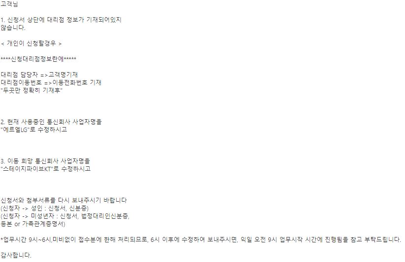 - 개인이 신청할 경우, 신청서 상단 신청대리점 정보에 본인 성명, 전화번호 넣는 것 잊지마세요!