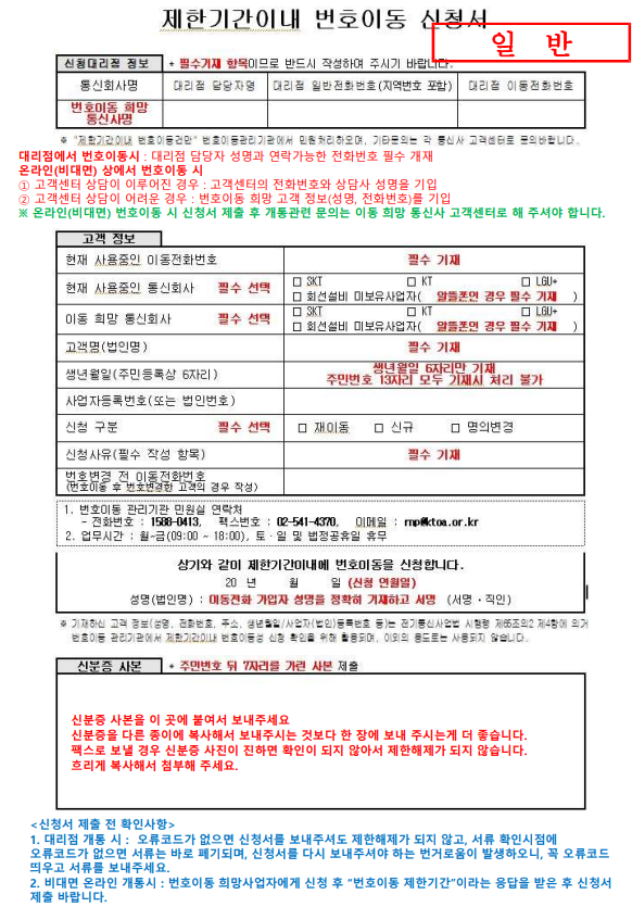 제한기간이내 번호이동 신청서는 아래와 같이 적어주시면 됩니다.