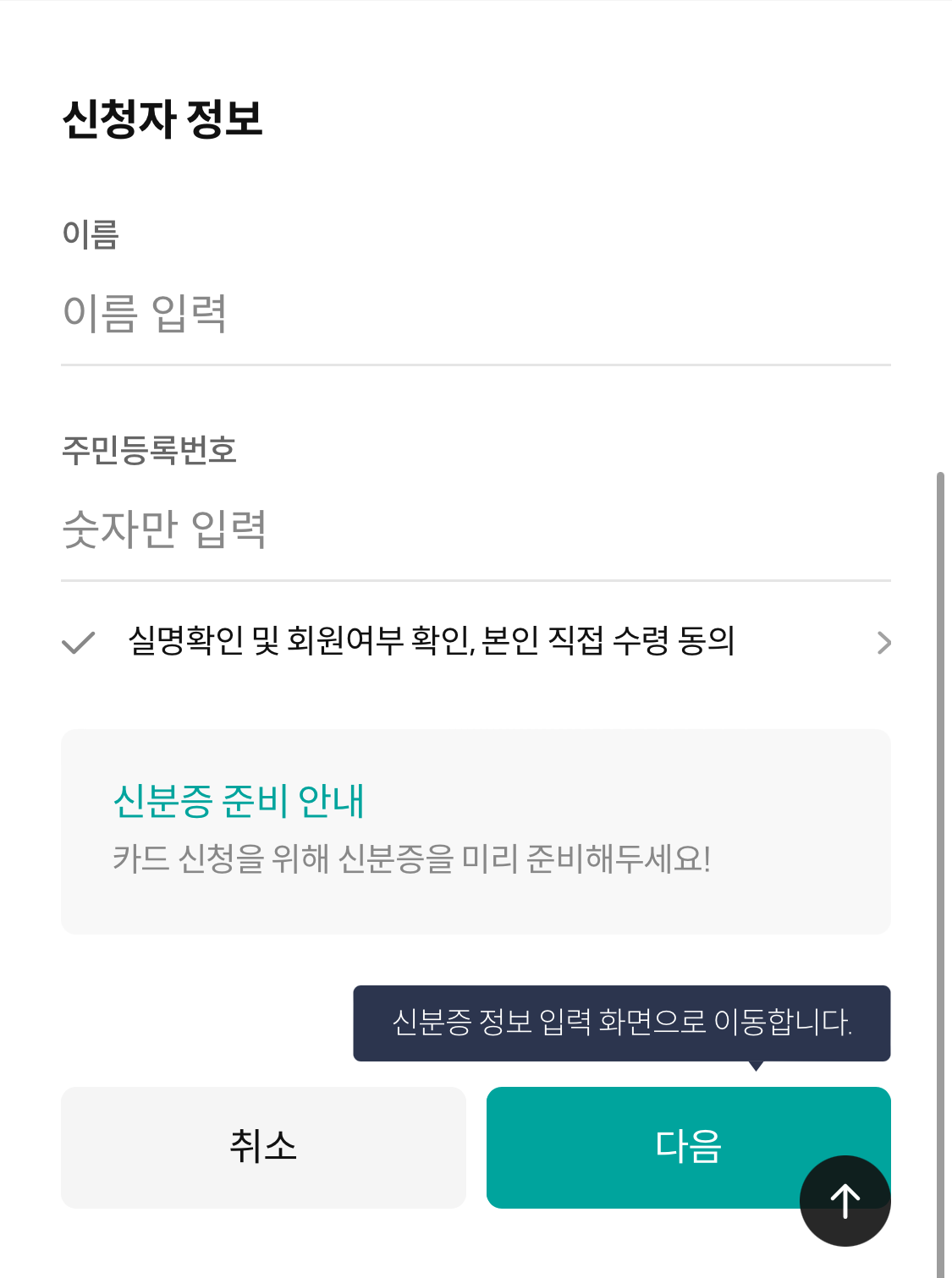 신청자 정보를 넣어줍니다. 이 단계에서 신분증이 반드시 필요해요! (없으면 낭패...ㅠㅠ)