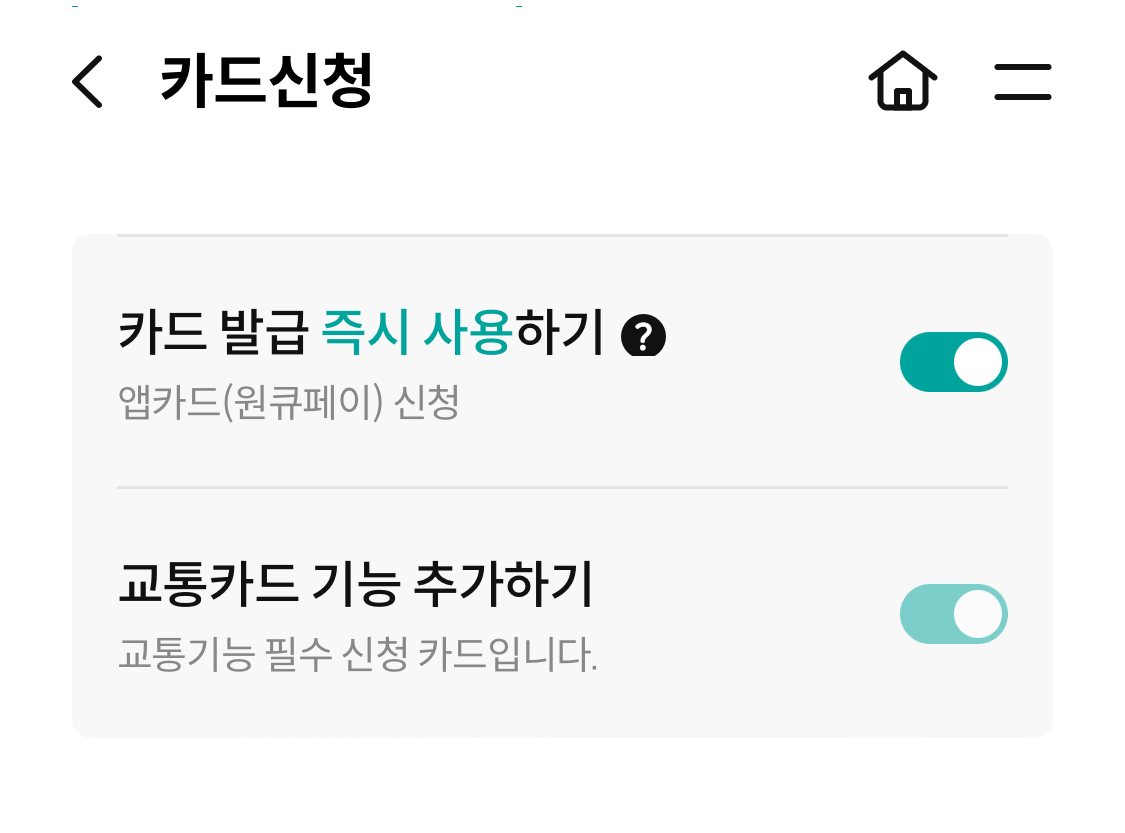 카드 발급 즉시 사용하기 선택해주었구요, 교통카드 기능도 추가해주었습니다.