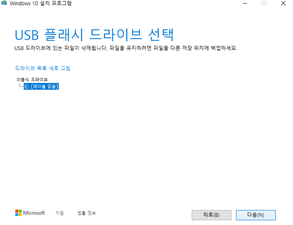 윈도우 설치 파일을 설치할 USB 드라이브를 선택해줍니다.