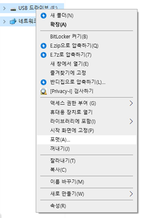 USB를 컴퓨터 본체에 꽂아주고 윈도우 탐색기를 클릭합니다. 윈도우 탐색기에서 포맷 드라이브 설치할 USB 위에 마우스 커서를 가져다 두고, 오른쪽 버튼을 클릭해줍니다. 그리고 포맷 버튼을 눌러주세요.