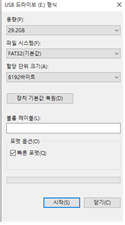 FAT32(기본값), 8192바이트를 눌러주고, 빠른 포맷을 체크해줍니다.