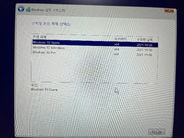 윈도우 10 HOME 인지, Education 인지, Pro 인지 선택해주세요. 저는 가장 일반적으로 사용하는 HOME으로 선택하였습니다.
