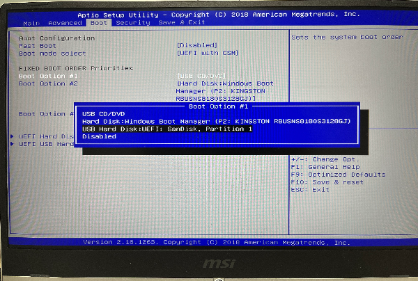 부팅파일이 설치된 USB를 선택해줍니다. 저의 경우에는 USB Hard Disk : UEFI: SanDisk, Partition1 로 나왔습니다.