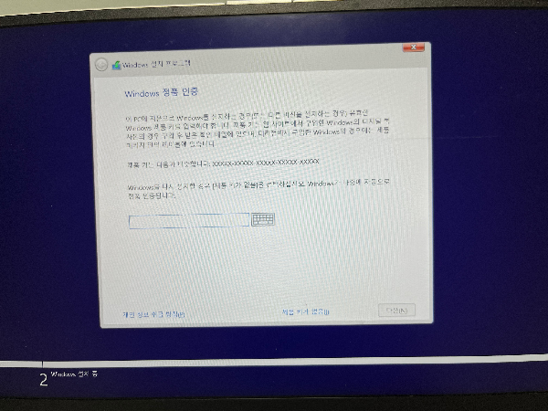 윈도우 정품 인증은 제품 키가 있으시면 바로 해두셔도 상관 없지만, 제품키가 없다면 제품 키 없음을 눌러주시면 됩니다.