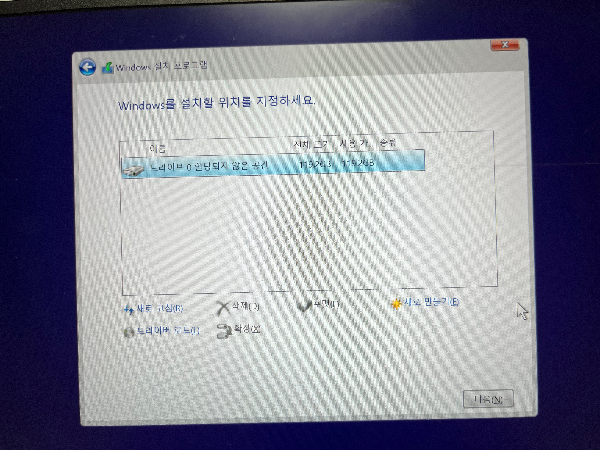 파티션이 여러 개 있다면 모두 삭제해주세요. 저는 파티션을 전부 없애는 방법을 사용하였습니다. 그리고 다음 버튼을 클릭해줍니다.