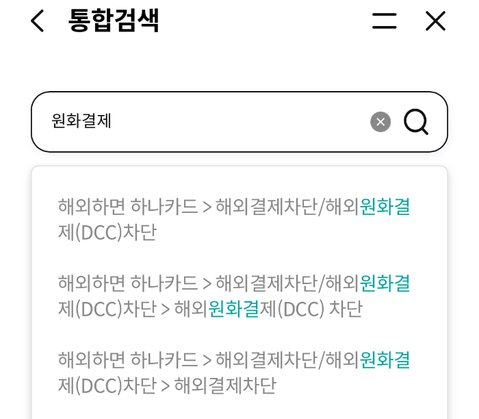 검색창에 '원화결제'라고 간단하게 적어주시면 됩니다. 그리고 맨 위 '해외하면 하나카드>해외결제차단/해외원화결제(DCC)차단'버튼을 눌러주세요.