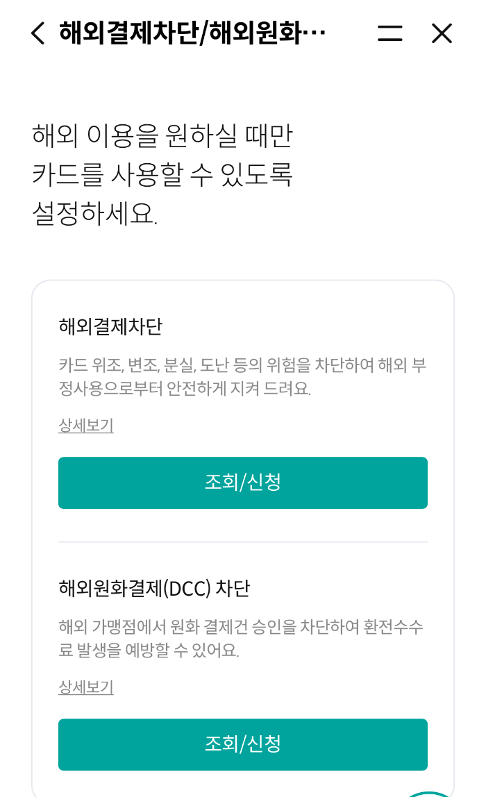 해외에서 이 카드로 인출도 하고 결제도 해야하니 해외결제차단은 하면 안됩니다! 그 밑에 해외원화결제 차단 버튼을 눌러주세요.